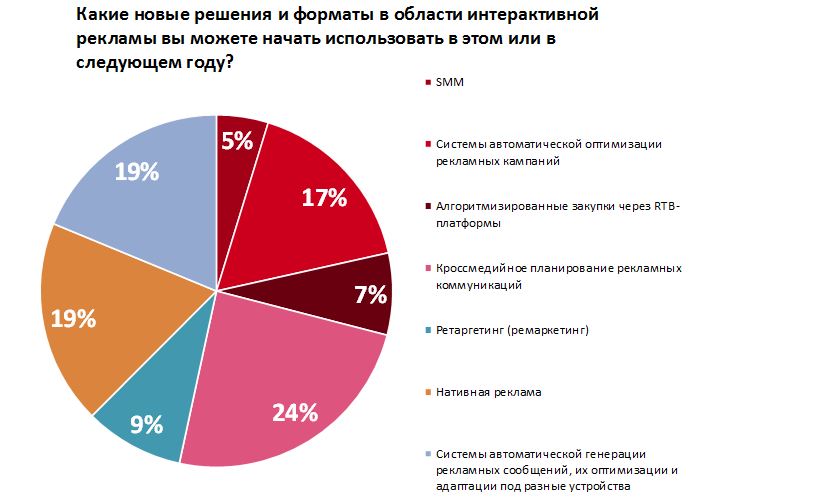 Подавляющее большинство (77%) полагает, что в текущем году доля интерактивной рекламы в общем бюджете вырастет. Многие компании начнут использовать кроссмедийное планирование, системы автоматической генерации рекламных сообщений и системы автоматической оптимизации кампаний. Возможно, кроссмедийное планирование сделает колоссальный рывок: если сейчас его применяет каждый третий клиент из пяти, в будущем станет каждый четвертый. При этом SMM, ретаргетинг и RTB активно используются компаниями.