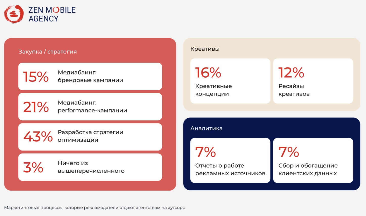 43% российских рекламодателей готовы отдать агентствам на аутсорс разработку стратегии оптимизации. 21% опрошенных назвали перформанс-кампании, 16% — креативные концепции. 15% респондентов хотели бы отдать на аутсорс брендовые кампании, 12% — ресайзы креативов. Такие данные содержатся в исследовании агентства Zen Mobile, которое есть в распоряжении Sostav.
