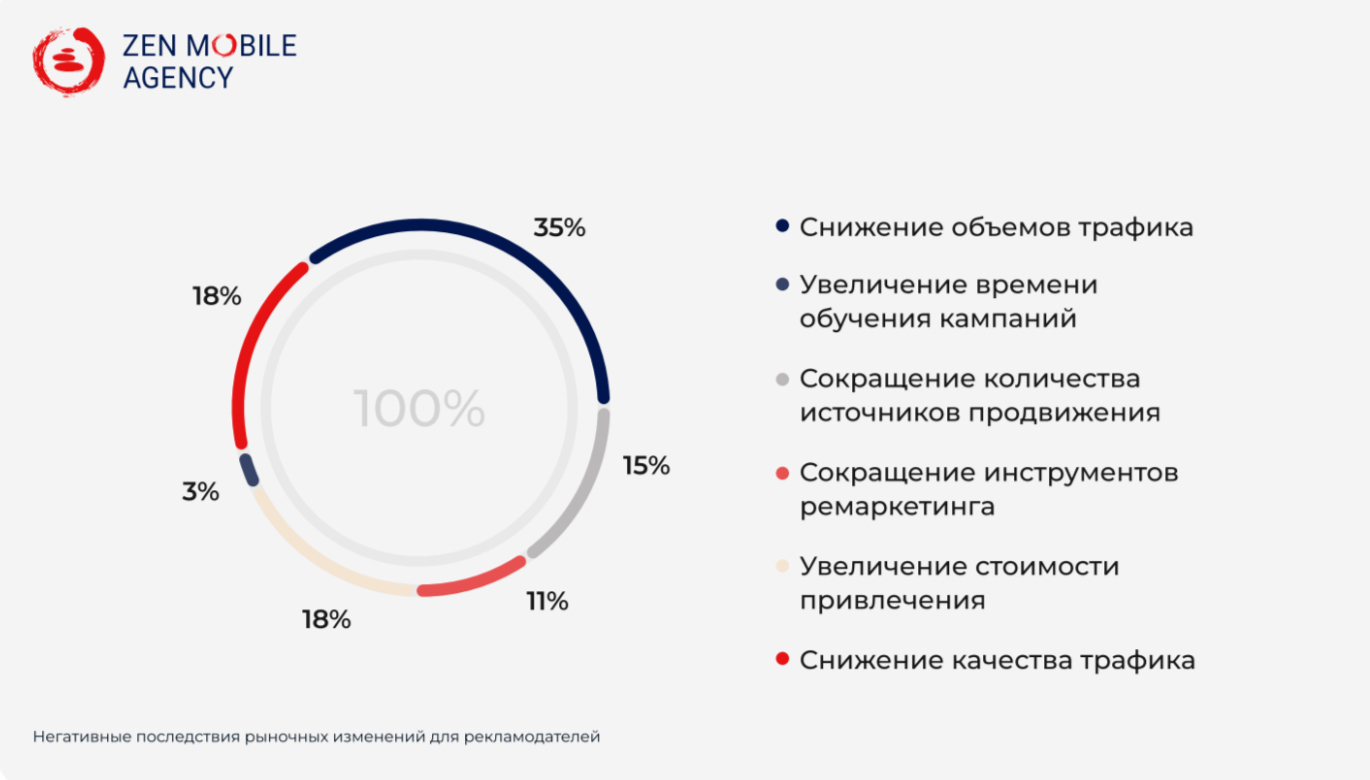 Рекламодатели перечислили, каких негативных последствий из-за изменений на рынке можно ожидать. В их числе снижение объёмов трафика (такое мнение выразили 35% орошенных), увеличение стоимости привлечения и снижение качества трафика (по 18%), уменьшение количества источников продвижения (15%), сокращение инструментов ремаркетинга (11%) и увеличение времени обучения кампаний (3%).