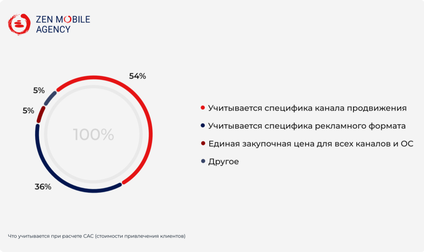 Также у респондентов спросили, как они рассчитывают стоимость привлечения клиентов. 54% учитывают специфику канала продвижения, 36% обращают внимание на специфику рекламного формата. 5% смотрят на единую закупочную цену для всех каналов.