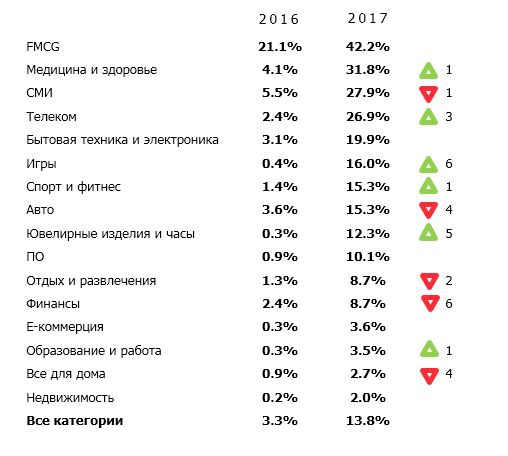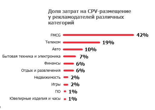 В 2017 году на видеоразмещение в партнерской сети myTarget пришлась почти четверть (22%) инвестиций рекламодателей (в 2016 году — лишь 4%). Одним из важных нововведений в 2017 году стало появление в myTarget модели оплаты CPV (cost per view), предполагающей оплату только в случаях просмотра ролика пользователем. С момента запуска она набирает популярность у рекламодателей: рост доли затрат на размещение по модели CPV отмечен во всех товарных категориях, самый значительный — в категории FMCG.