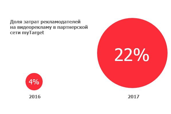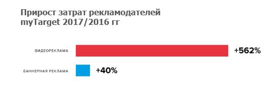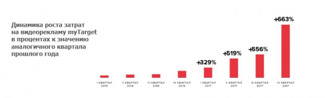 Видеореклама стала самым динамичным сегментом на рекламной платформе myTarget в 2017 году. Инвестиции рекламодателей в видеоразмещение выросли почти в 7 раз (+663%), а доля затрат на видеорекламу выросла с 3% до 14%. Высокие темпы роста объясняются не только популярностью видеоразмещений, но и введением новых форматов.