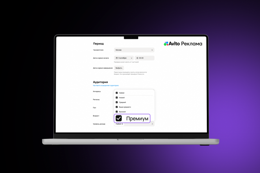 Чтобы настроить таргетинг на высокодоходную аудиторию, нужно в кабинете «Авито Рекламы» нажать на кнопку «Создать кампанию», определиться с ее типом и моделью оплаты, задать сроки и бюджет, а затем выбрать характеристики «Высокий» или «Премиум» в блоке «Аудитория».