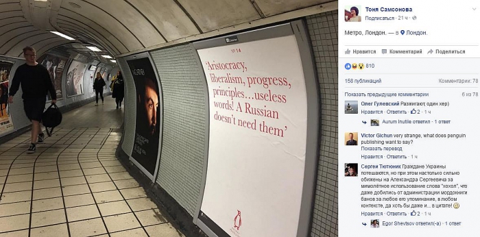 Фотографию с рекламным плакатом разместила в Facebook журналист и создатель проекта TheQuestion.ru Тоня Самсонова. Поскольку фраза была не подписана, комментаторы начали возмущаться отношением англичан. Немногие из пользователей узнали классическое произведение.