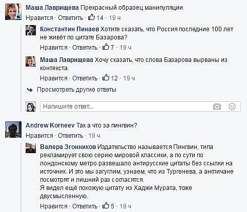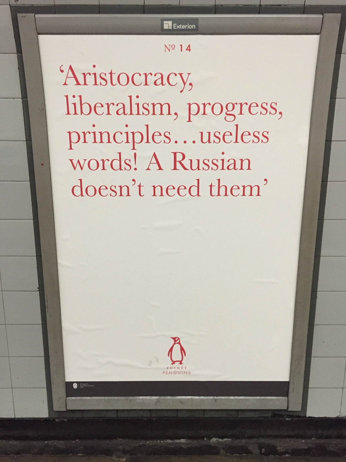 Британское издательство Penguin Books обвинили в разжигании ненависти к русским. Поводом для таких заявлений стала реклама в лондонском метрополитене. На серии постеров были размещены цитаты из литературных произведений, в том числе из романа Ивана Тургенева «Отцы и дети».