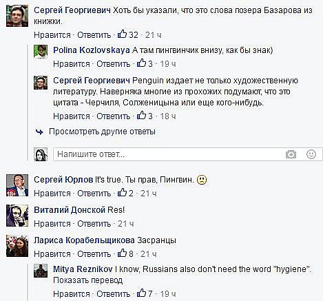 На сайте Penguin Books также имеется данная цитата. Переводчиком романа является Питер Карсон. Креативный директор брендинговой компании «Борщ» Сергей Логвин отметил, что фраза вырвана из контекста, перевод не точный. «Формируется определённое, чёткое и простое представление о русских.