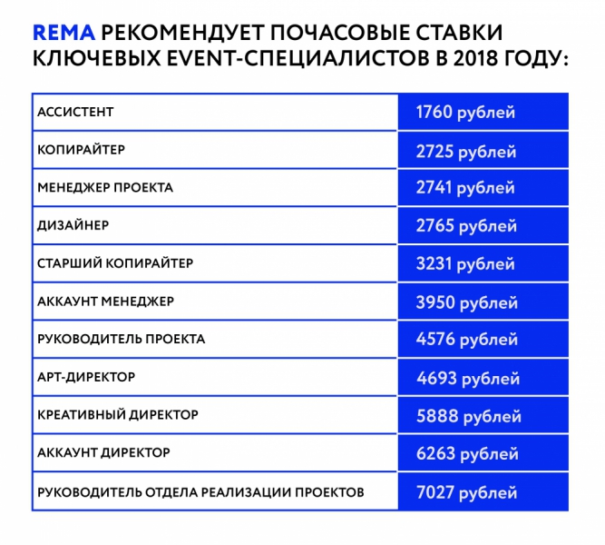 Российский рынок event-маркетинга — высококонкурентная отрасль, которая интенсивно развивается за счет растущего спроса на event-услуги и появления новых игроков. Каждый год на рынок выходит около ста новых агентств, что снижает общую рентабельность бизнеса и усложняет коммуникационные задачи. Между тем тендерная система диктует необходимость эффективно расходовать средства. В условиях жесткой экономии и конкуренции возникает вопрос об общих стандартах ценообразования на российском рынке event-услуг. Таким стандартом могут стать почасовые ставки ключевых специалистов, рассчитанные Ассоциацией событийного маркетинга России (REMA).