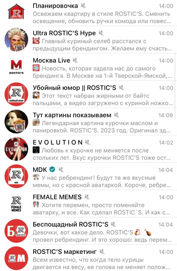 Telegram-каналы со большим количеством подписчиков приняли участие в «флешмобе ренейминга»: изменили своё название и аватарку, но подчеркнули, что при этом их контент остаётся прежним. Это ренейминг в стиле Rostic's — название новое, но вкус всё тот же, объясняет Nectarin.