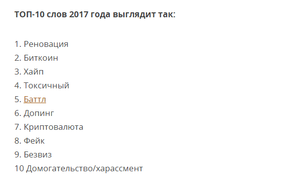 Главным словом года стала «реновация». На втором месте списка — «биткоин», на третьем — «хайп». Кроме того, в ТОП-10 вошли слова «токсичный», «баттл», «допинг», «криптовалюта», «фейк», «безвиз» и «домогательство/харассмент».
