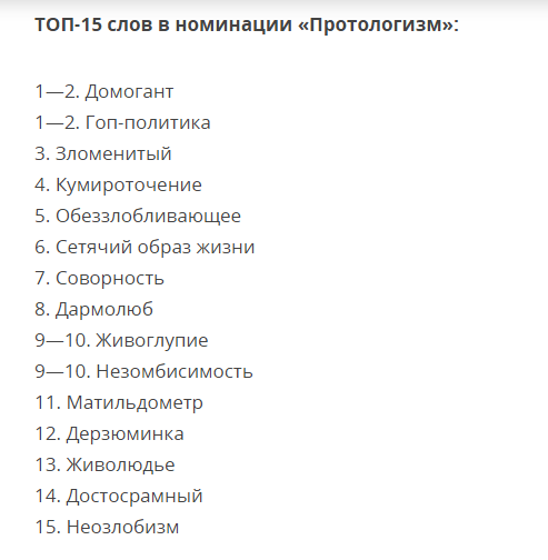 Также экспертный совет составил ТОП-15 протологизмов или авторских неологизмов. Первое место в нем поделили слова «домогант» и «гоп-полититка», а третье — «зломенитый».