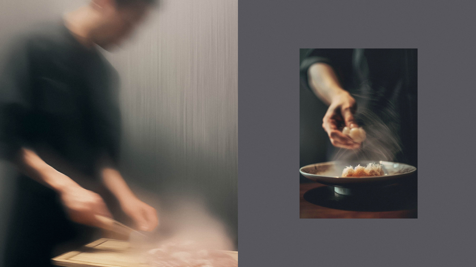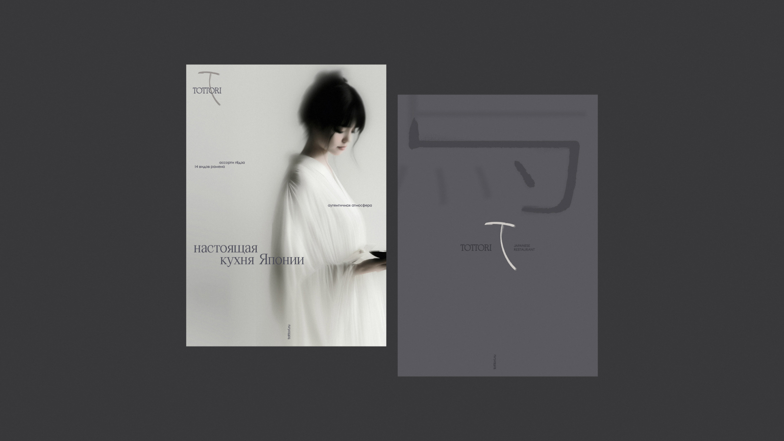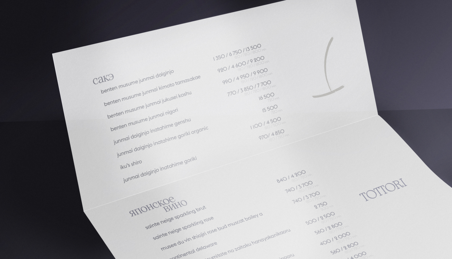 В начале работы мы пытались ориентироваться на традиционные японские символы: восходящее солнце, сад камней. Но в процессе захотелось уйти от буквальных ассоциаций, сделать фирменный стиль Tottori более деликатным и нюансным. Интересной задачей было совместить японскую традиционность и современность, присущую заведению в большом городе. Мы старались сделать дизайн очень лаконичным, и частично скрытые иероглифы отлично в этом помогли. Особенно гордимся нейрофотостилем. Его удалось сделать утонченным: изображения будто вибрируют, показывают красоту и мимолетность момента.