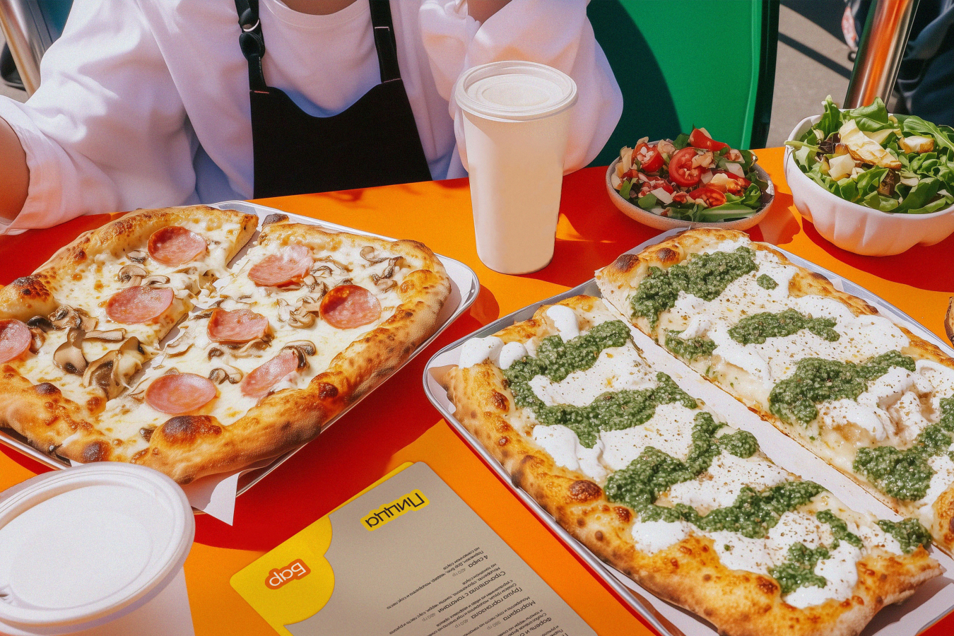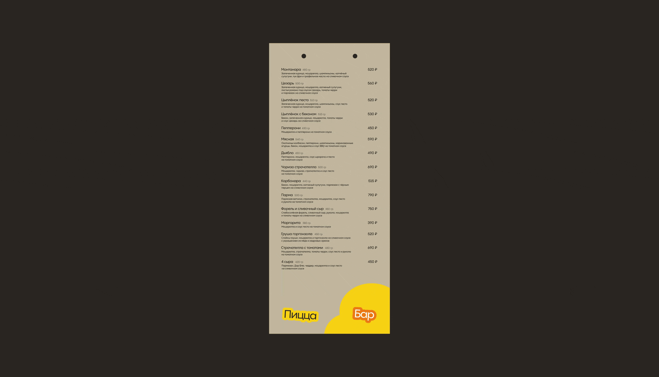 Визуальная система бренда органично легла в основу всех ключевых носителей. Айдентика адаптирована для упаковки — включая коробки для пиццы, стаканы, бумажные подложки и сумки для доставки — а также для интерьерных решений: плейсматов и формы для персонала. Меню было разработано в трех форматах: печатном (с характерным фигурным краем), барном и диджитал.