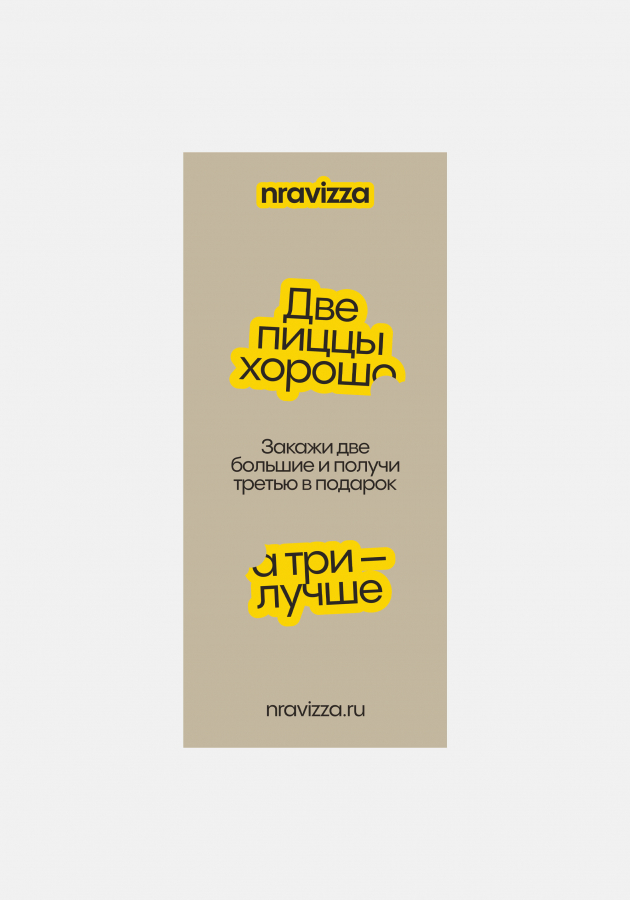 Название стало логичным продолжением позиционирования: команда отталкивалась от идеи атмосферного, понятного и универсального бренда. Nravizza — это результат объединения слов «нравится» и «пицца».