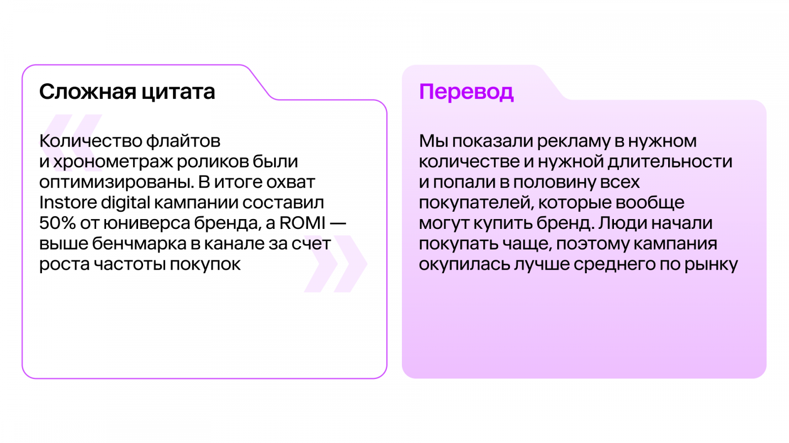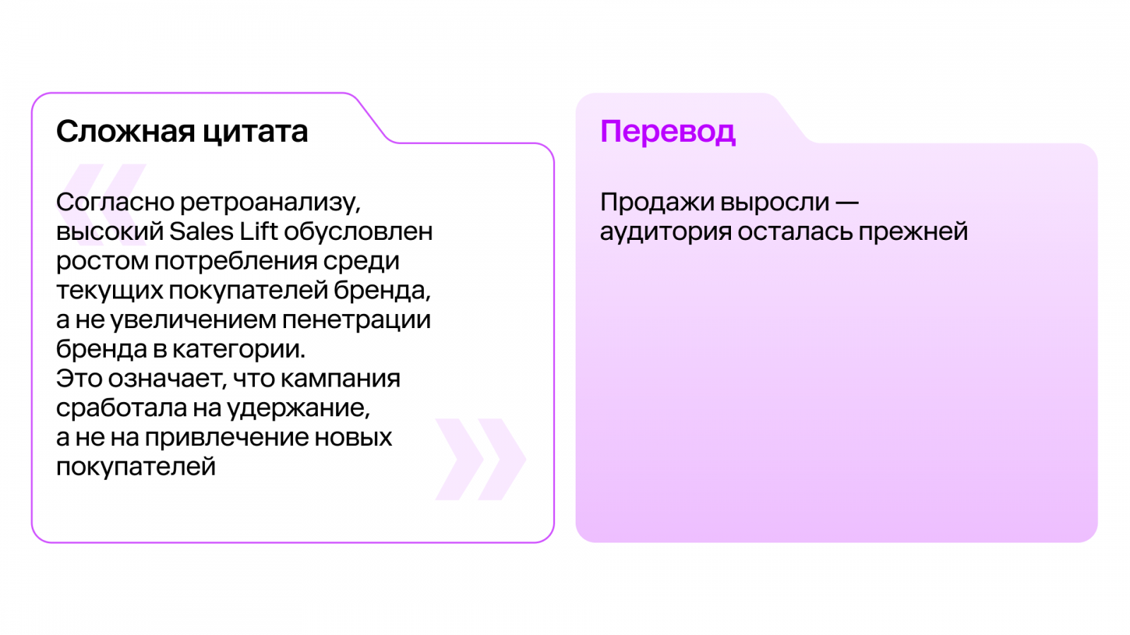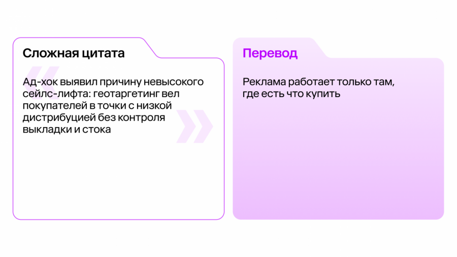 Внутри каждой главы — живые пояснения ключевых терминов и «перевод сложных цитат», взятых из реальных переговоров. Теперь, когда вам скажут: «Кампания сработала на удержание, а не на пенетрацию», — вы будете точно знать, что продажи выросли за счет текущих покупателей, а новые так и не пришли.