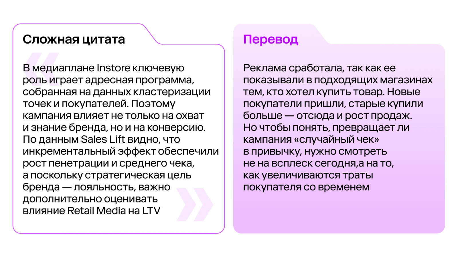 Есть два способа вести диалог в Retail Media. Первый — красивый. Вы говорите: «Мы проанализировали инкрементальность с учетом кластеризации ЦА и получили позитивную динамику LTV благодаря оптимизации флайтов». Собеседник кивает, хотя на самом деле думает, не позвать ли переводчика. Второй — человеческий. Вы говорите: «Мы поняли, кто наши покупатели, показали рекламу тем, кому надо, и люди стали покупать чаще. Деньги не потеряли, а заработали». Эксперты собрали словарь, где за каждым термином стоят понятные бизнес-смыслы: рост продаж, привлечение клиентов и эффективность вложений. О том, как устроен этот справочник и как им пользоваться, Sostav рассказала Элина Лопатюк, директор по продукту и консалтингу