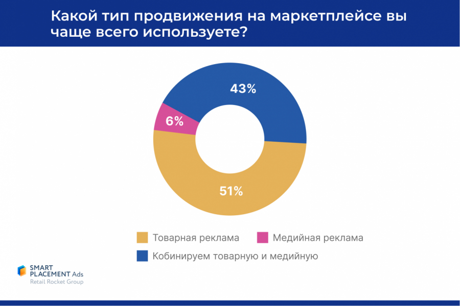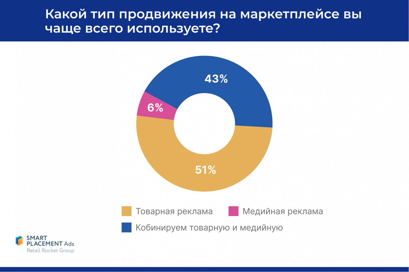 Большинство опрошенных активно используют встроенные рекламные инструменты онлайн-площадок, отмечают аналитики Smart Placement Ads и «Детского мира». 81% респондентов рассказали, что часто продвигают товары с помощью внутреннего инвентаря маркетплейсов. При этом 51% опрошенных предпочитают формат товарной рекламы (продвижение товара в результатах поиска, категории и так далее), а 43% — комбинируют его с медийным размещением (баннеры и ролики). Медийную рекламу в «чистом» виде используют только 6% респондентов.
