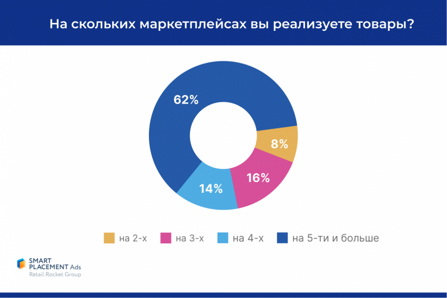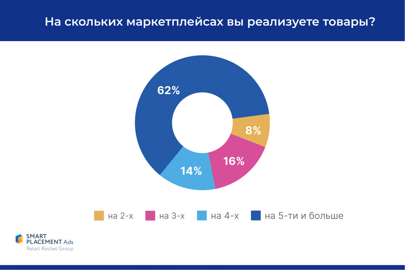 Согласно данным опроса, всего 8% респондентов продают товары на двух ecom-площадках: 30% — реализуют продукцию на трёх или четырех маркетплейсах, а 62% — на пяти и больше.