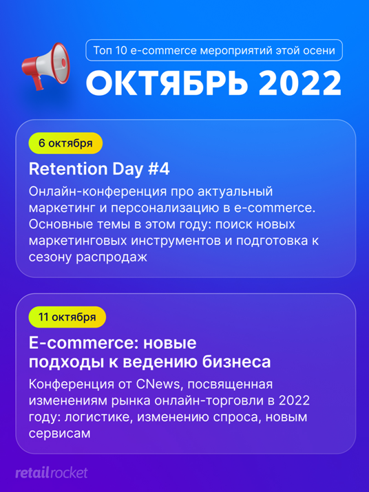 Когда: 6 октября - E-commerce: новые подходы к ведению бизнеса. Конференция от CNews, посвящённая изменениям рынка онлайн-торговли в 2022 году: как решить логистические проблемы, за кем будущее — маркетплейсами или онлайн-магазинами, как изменился спрос и какие сервисы нужны, чтобы оставаться конкурентоспособными.