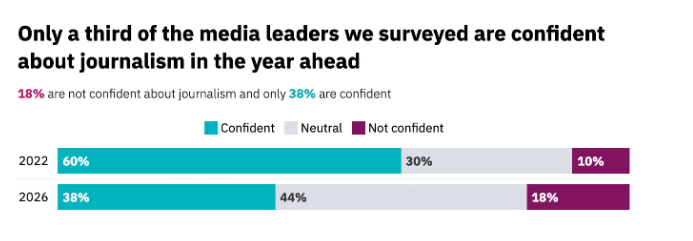 76% коммерческих издателей называют платный контент своим главным приоритетом, что значительно опережает нативную рекламу (64%) и мероприятия (54%). Однако лишь 38% респондентов уверены в перспективах журналистики — на 22 п.п. меньше, чем четыре года назад. Среди причин — политическое давление, падение посещаемости цифровых платформ и прекращение финансирования независимых СМИ со стороны USAID.
