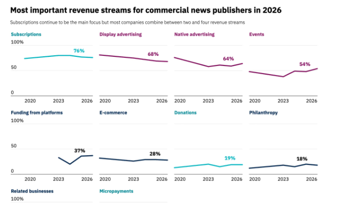Новостные издатели в 2026 году делают ставку на подписные модели и прямой контакт с аудиторией, а не на трафик из соцсетей и поисковиков, который стремительно падает из‑за внедрения ИИ. Они хотят меньше зависеть от рекламы и алгоритмов, инвестируя в платный контент, видео, подкасты и мероприятия, а также надеются на доходы от брендированной рекламы. Об этом говорится в отчете Института изучения журналистики Reuters.
