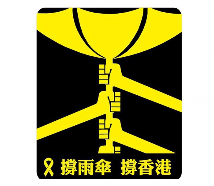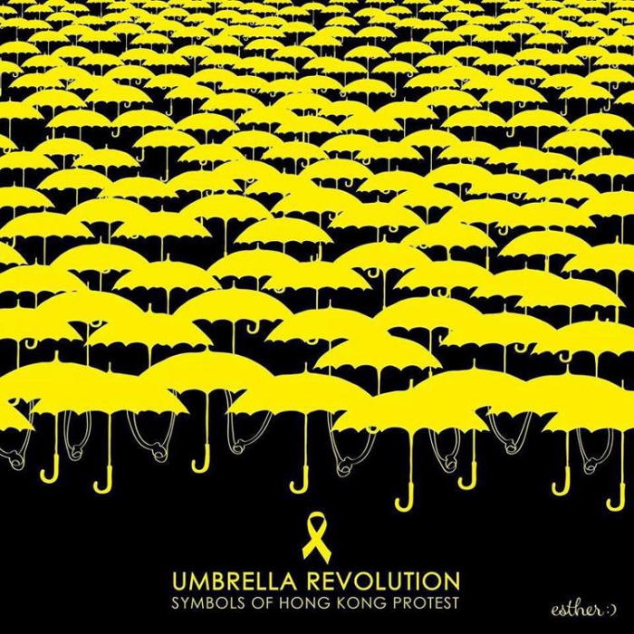 У массовых демонстраций в Гонконге появилась собственная айдентика. Протестующие выходят на улицы с зонтиками, чтобы защитить себя от перцовых баллончиков, применяемых полицией. Именно идею с желтым зонтом взял за основу айдентики художник Политехнического университета, креатор Кейси Вонг.