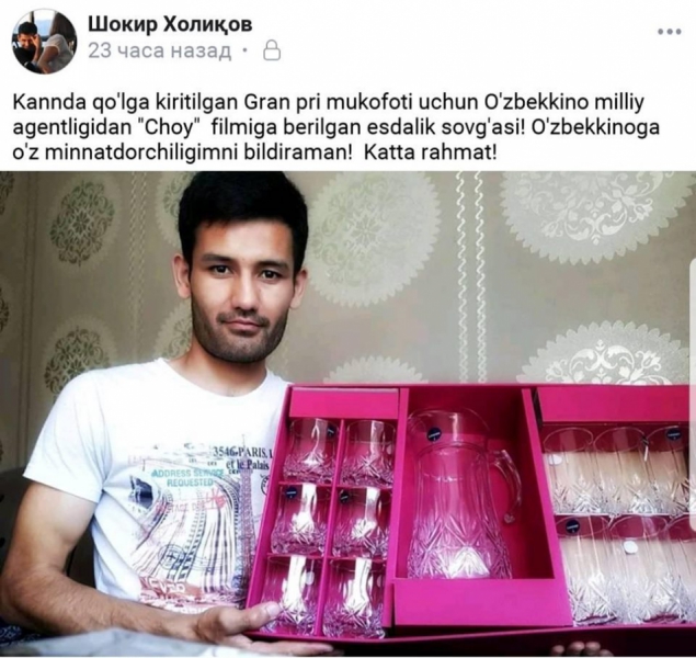 Шокир Холиков взял Гран-при на 72-м международном Каннском кинофестивале. По такому случаю, у себя на родине от «Узбеккино» молодой режиссер тоже получил памятный приз — сервиз. «Ни слова больше» — мысленно произнесли пользователи соцсетей, и их фантазии было не остановить.