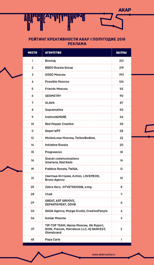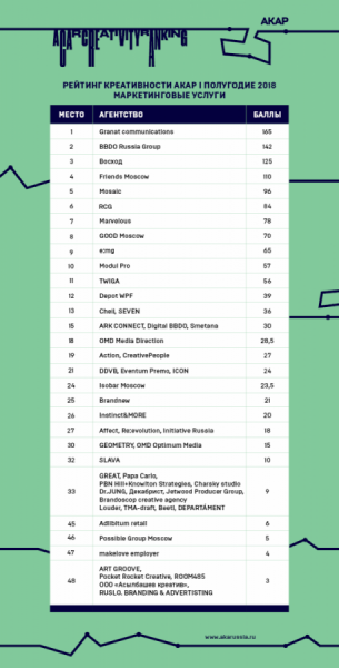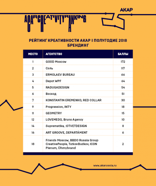Ассоциация коммуникационных агентств России (АКАР) представила результаты Рейтинга креативности агентств по результатам первого полугодия 2018 в четырех сегментах: «Реклама», «Брендинг», «Маркетинговые услуги» и «Digital».