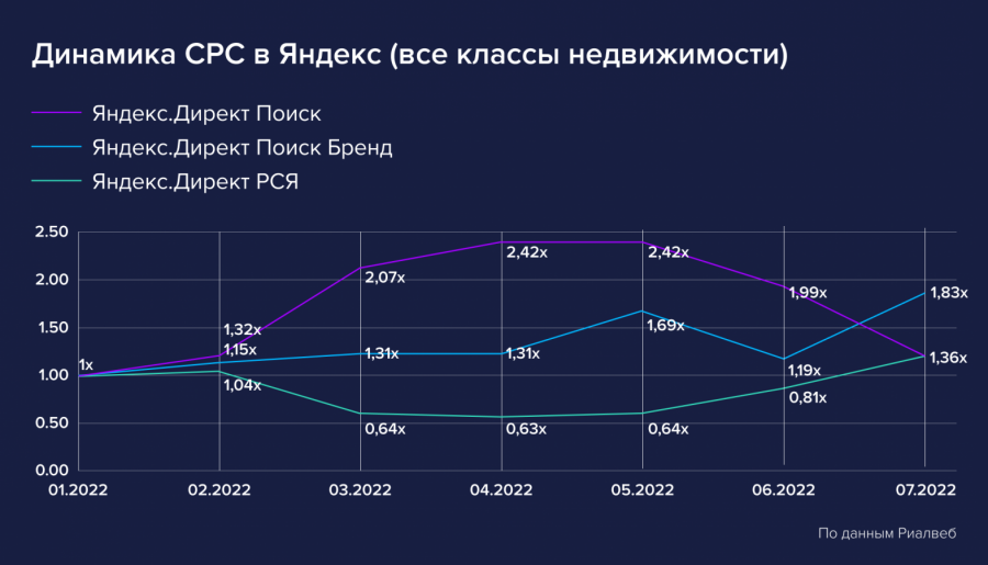 Например, стоимость клика в поиске «Яндекс.Директа» в июне была в 2 раза выше, чем в январе 2022-го и в 1,5 раза по сравнению с февралем. К июлю мы наблюдаем небольшой откат к уровню февральских показателей.