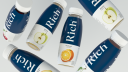 Rich впервые ушел от полностью белого цвета. В новом фирменном стиле авторы дизайн-студии Tuman объединили его с синим и разделили упаковку на два визуальных блока.