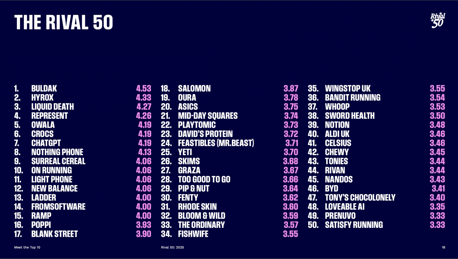 На конференции Web Summit, прошедшей в Лиссабоне, исследовательская компания Rival и Бизнес-школа Имперского колледжа Лондона представили индекс Rival 50. Он призван определить, чем мировые бренды-дизрапторы отличаются от остального рынка. В основе исследования — более 10 тыс. часов сбора и верификации информации с участием более 300 CMO. К проекту привлекли и экспертное жюри в лице таких звезд индустрии, как Фернандо Мачадо, Кристен Кавалло и Дин Арагон. С полным отчетом можно ознакомиться в Telegram-канале Юлии Удовенко, вице-президента по маркетингу