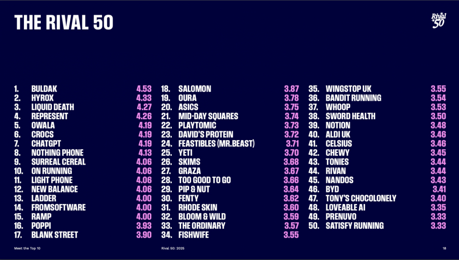 В топ-50 от Rival вошли как проверенные временем бренды, так и новые игроки из США, Южной Кореи, Китая, ЮАР и Европы. В списке лучших можно обнаружить бренд белья Ким Кардашьян Skims, сладости Feastables от MrBeast и названные в честь «Давида» Микеланджело протеиновые батончики от Питера Рахаля, который ранее совместно с Джаредом Смитом продал RxBar за 600 млн долларов. Давайте обратимся к некоторым брендам, попавшим в первую десятку, и разберем рецепт их успеха. Удастся ли приземлить их смыслы на родную почву? Вопрос риторический.