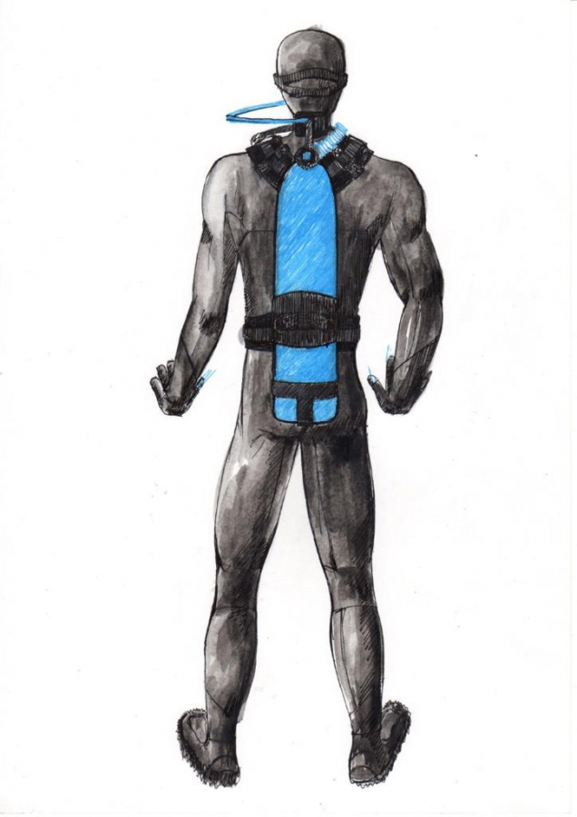 Баллон с кислородом, несмотря на свою условность, стал крайне важным элементом всех съемок. Именно в нем находился центр управления освещением водолазного костюма.