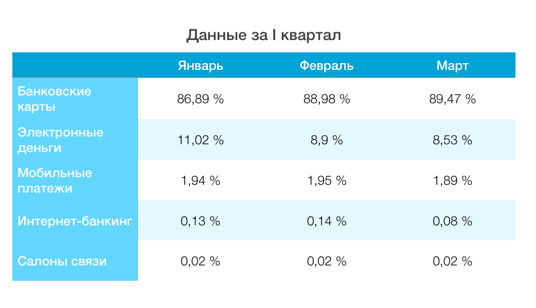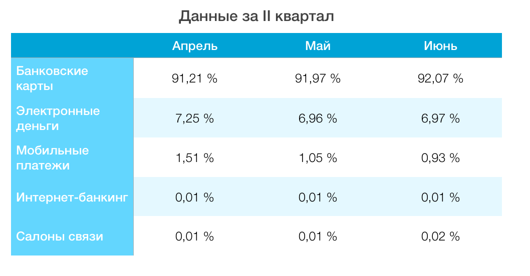Интернет-банкинг и платежи через салоны связи остаются самыми непопулярными способами. С начала года показатели продолжали падать, на июнь их доли составили 0,01% и 0,02% соответственно.