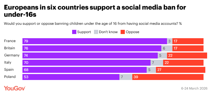 Несмотря на широкую поддержку, европейцы сомневаются в практической пользе. Так, в Великобритании 54% считают, что запрет будет неэффективным — включая 46% тех, кто его поддерживает. Ситуация меняется, когда вопрос касается конкретных механизмов запрета, например, необходимости подтверждения возраста при каждом входе в систему. Даже в Польше, где лишь незначительное большинство поддержало запрет, требование проверять возраст при регистрации в соцсетях одобряют уже 78% респондентов. В остальных пяти странах этот показатель колеблется от 79% до 87%.