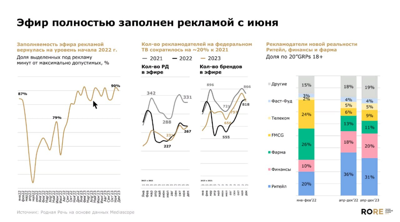 В 2023 году телевизионный инвентарь был полностью заполнен, бонусное размещение сократилось до минимума, отметил спикер. При этом количество брендов, которые рекламируются в федеральном масштабе, сократилось.