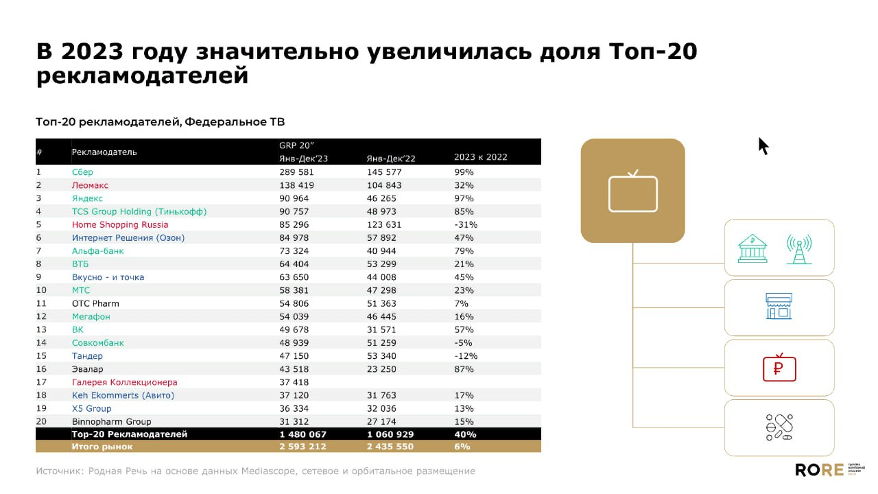 Доля топ-20 рекламодателей на телевидении составила 57%. Как указал Белоглазов, сейчас происходит укрепление — меньшее количество крупных рекламодателей определяет объёмы рынка.