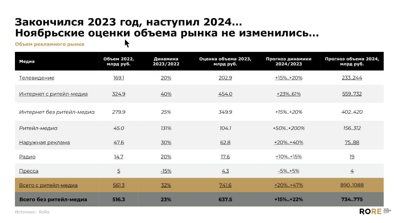 Согласно прогнозу группы, в 2024 году рекламный рынок в России вырастет на 15−22% (без учёта ритейл-медиа) — до 734−775 млрд руб. С учётом ритейл-медиа рост составит 20−47% — до 890−1088 млрд руб.