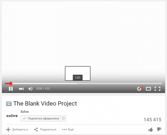 Компания создала самое некреативное вирусное видео — абсолютно пустой четырехминутный ролик, без изображений и звука, без названия и описания, но со ссылкой на сайт solve-ideas.com. Заголовок The Blank Video Project был добавлен уже после окончания эксперимента. Solve продвигало проект в виде пре-роллов TrueView, которые таргетировали на американскую аудиторию. Пользователи могли пропустить рекламу через 5 секунд, при этом агентство получало деньги только за просмотр минимум 30 секунд.