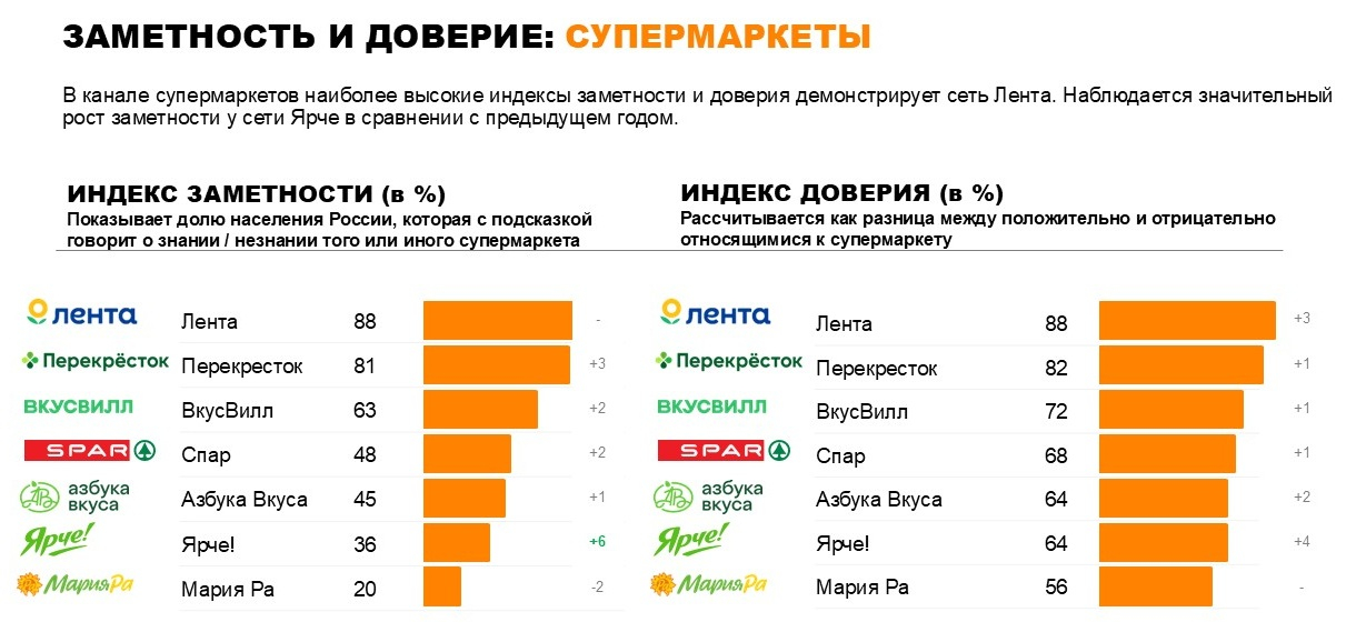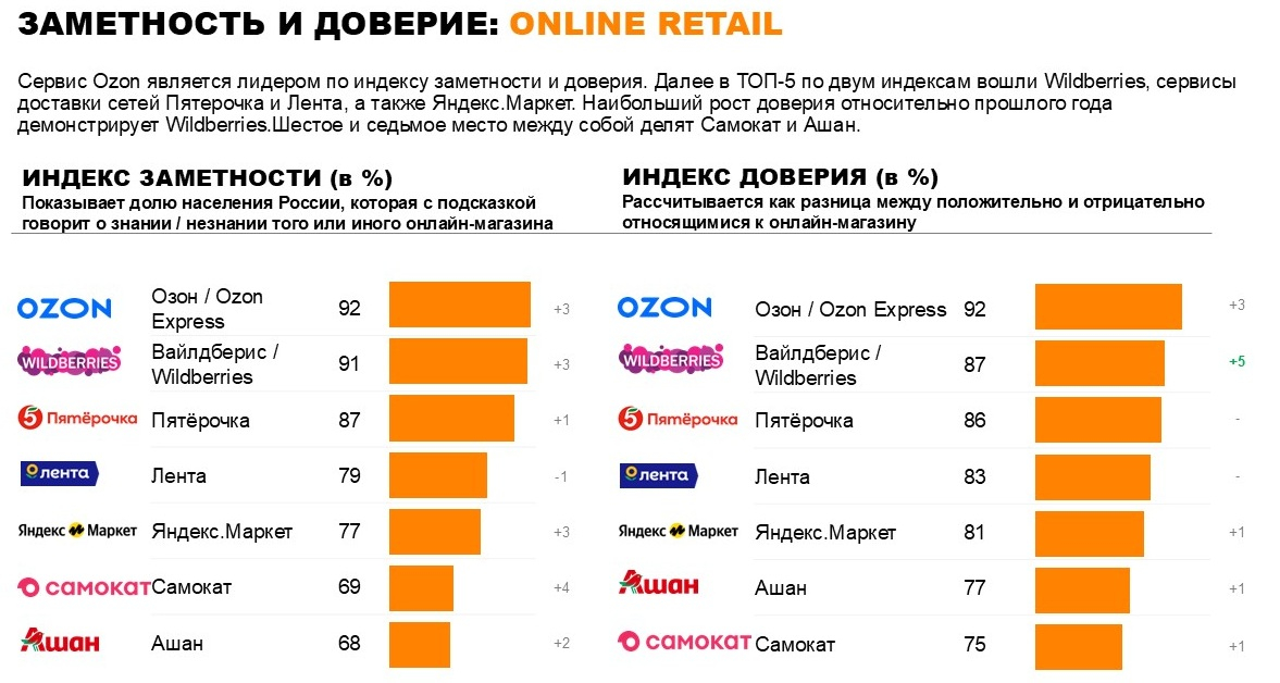 В онлайн-сегменте розничной торговли лидерство по показателям узнаваемости и потребительского доверия удерживает маркетплейс Ozon, успешно формируя лояльную аудиторию среди цифровых покупателей. На втором месте располагается Wildberries — еще один важный игрок на рынке электронной коммерции, закрепившийся в повседневных покупательских практиках россиян.