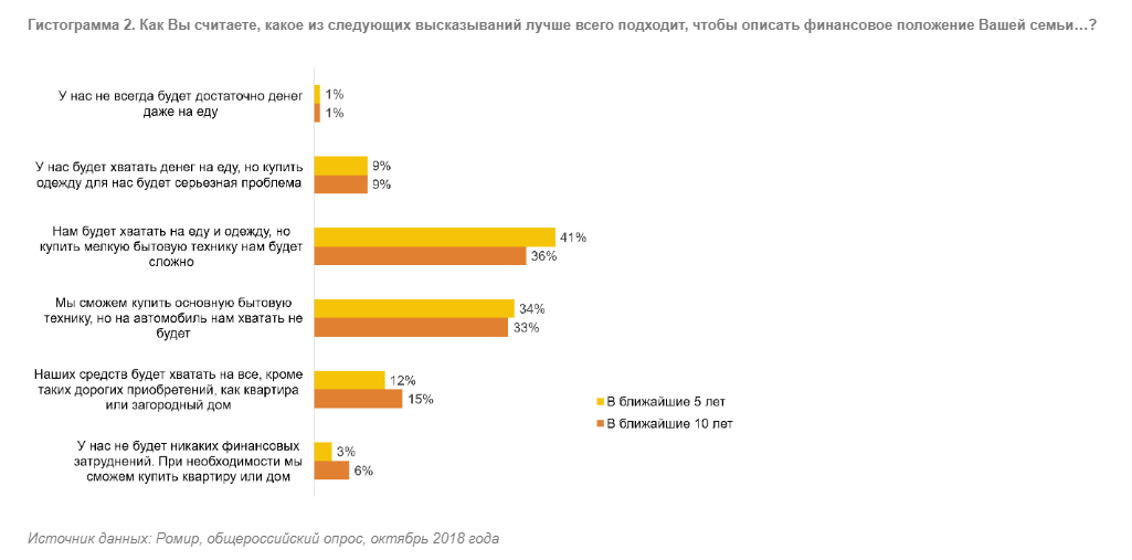 По-прежнему наибольшая часть опрошенных считает, что их финансов будет хватать только на самое необходимое — еду и одежду. Однако 15% россиян рассчитывает через 10 лет достичь такого уровня дохода, который позволит приобрести автомобиль. Через 5 лет о таких перспективах заявил каждый восьмой респондент (12%). Абсолютного финансового благополучия, когда можно позволить себе любую покупку, включая загородный дом, в горизонте 5 лет планируют достичь (или сохранить) 3% респондентов, а через 10 лет — уже вдвое больше (6%).