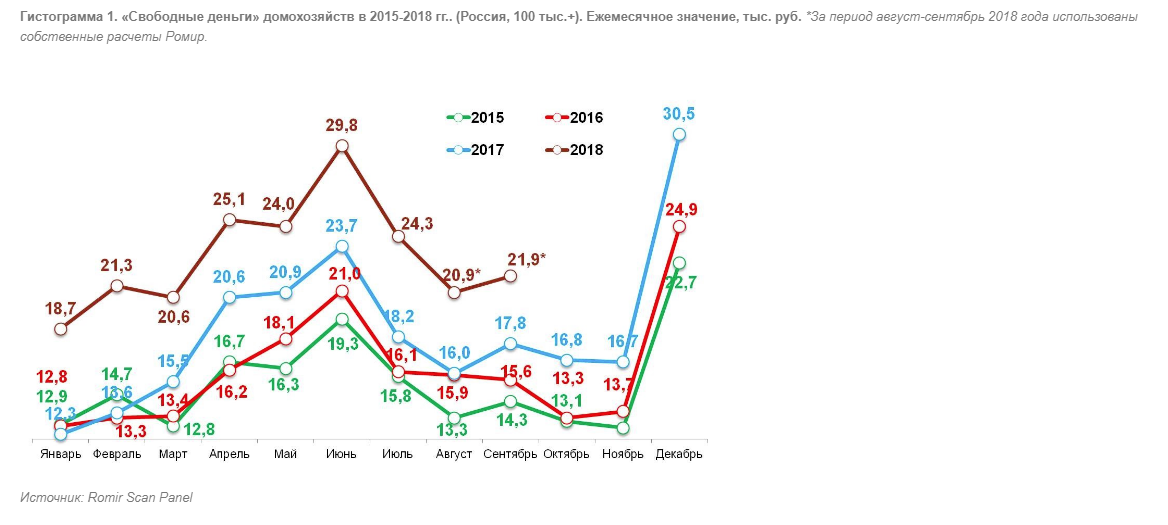 Индекс «свободных денег» «Ромира» — разница между доходами домохозяйства и тратами на необходимые товары и услуги. Средние доходы домохозяйств определяются на основе расчетов «Ромира» и Росстата, а оценка затрат производится на основе данных скан-панели домохозяйств холдинга. Она базируется на данных потребления 40 тысяч россиян, 15 тысяч домохозяйств в 220 городах страны.