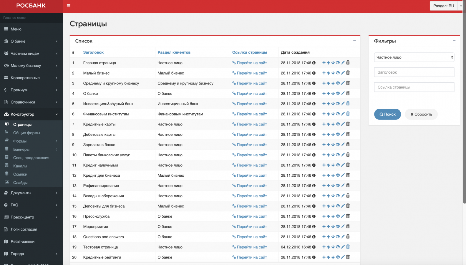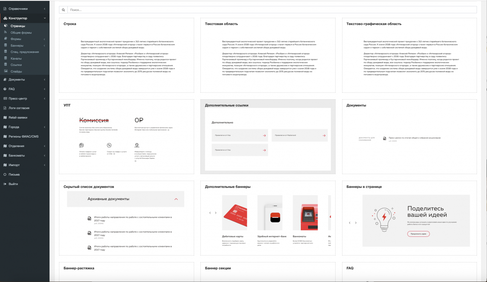 Уникальный конструктор страниц позволяет быстро создавать новые страницы сайта из различных функциональных блоков, которые наполняются специфическим контентом или включают в себя другие функциональные блоки.