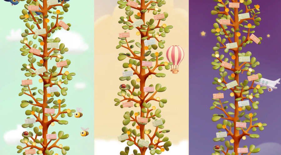 Пространство, пронизанное магией, безопасностью и детской наивностью — весь сюжет немного напоминает сказку. Волшебные бобы, дерево, на котором растут монеты… Заходя в игру, пользователь должен выбрать горшочек, в котором будет расти дерево. Сначала он сажает в него семечко и в первый раз получает лутбоксы — три лейки, в одной из которых вода. Выбор лейки стоит игровую попытку. Чтобы растить и собирать урожай в виде бонусов, нужно заходить ежедневно. Такую игру по механике «денежный урожай» придумали в честь юбилея «Росбанка» креаторы агентства