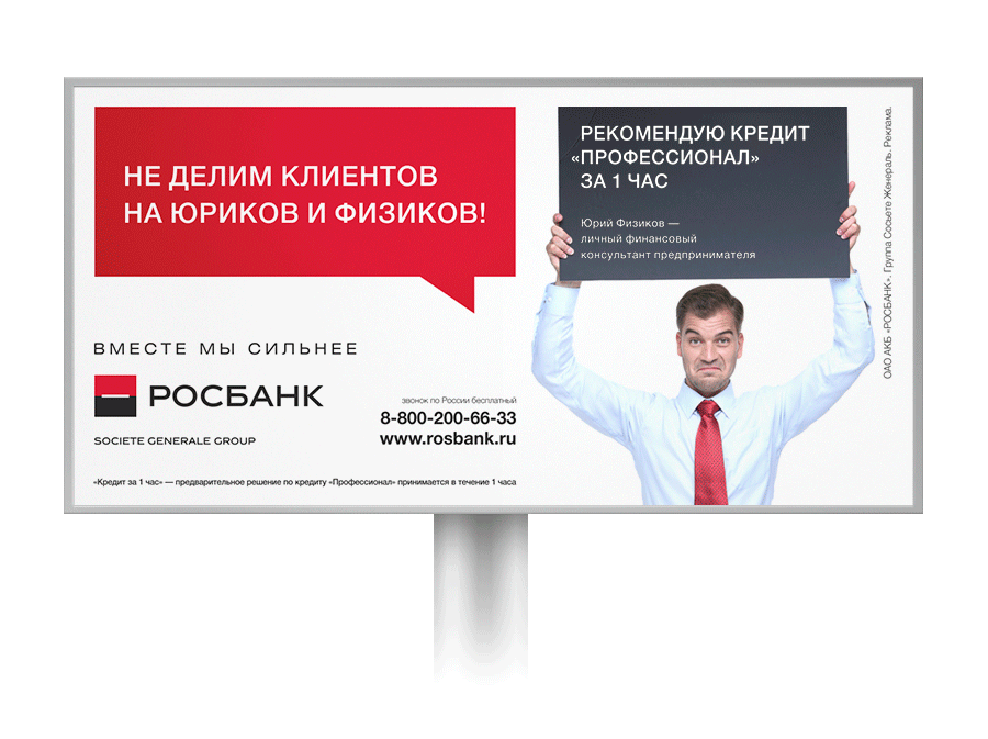 Ожидается, что Юрий Физиков как главный герой кампании будет представлять и рекомендовать продукты и предложения «Росбанка» для предпринимателей. На сегодняшний день в разных городах России появились рекламные щиты с участием Юрия Физикова, продвигающие кредит «Профессионал».