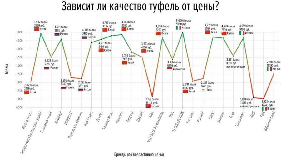 Самые дорогие туфли из исследования — Baldinini Trend (Италия) за 16 790 рублей — набрали только 2,5 балла. А две других дорогих марки туфель — Fabi (Италия) за 12 240 рублей и Hogl за 11 865 рублей — и вовсе расположились на двух последних строчках рейтинга. В свою очередь, половина туфель, вошедших в топ-10, стоили дешевле 5 000 рублей. Причем все они сшиты из кожи: и верх, и подкладка, и стелька. В топ же вошли одни из самых дешевых туфель, принявших участие в исследовании. Это Rendez-Vous by Massimo Santini и «Юничел».