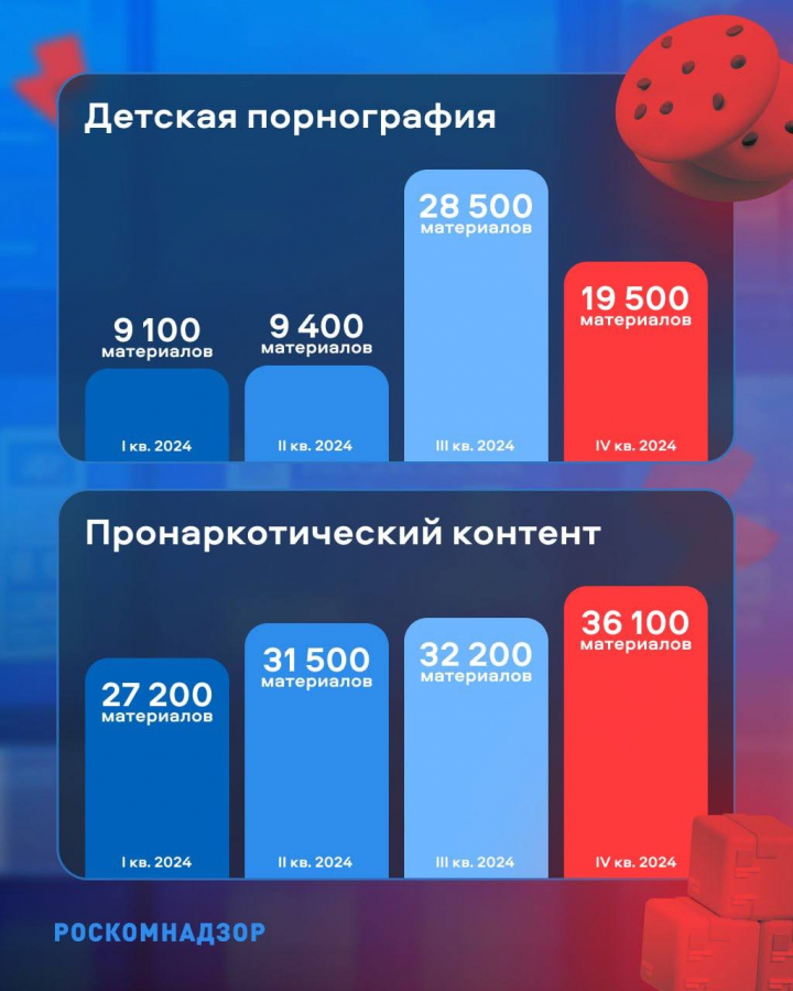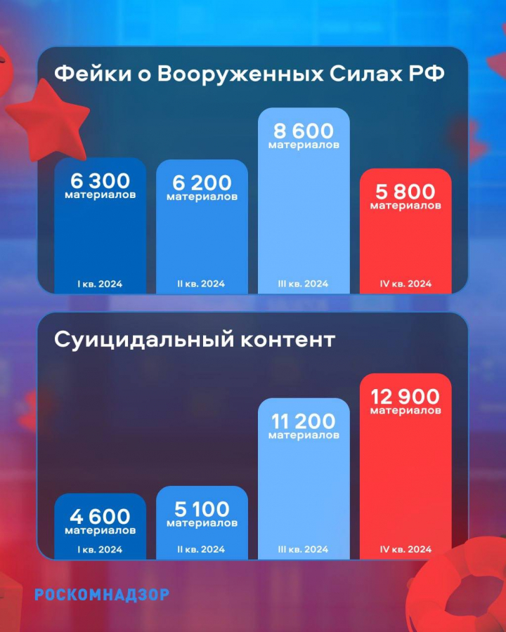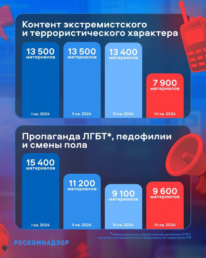 В четвертом квартале 2024-го наблюдался спад в блокировке материалов с фейковой информацией о Вооруженных силах РФ — 5,8 тыс. единиц. Показатель стал самым низким за год. В то же время был зафиксирован рост числа заблокированных материалов, пропагандирующих ЛГБТ (ЛГБТ-движение признано экстремистским и запрещено в России), педофилию и смену пола — 9,6 тыс. против 9,1 тыс. в третьем квартале 2024 года.