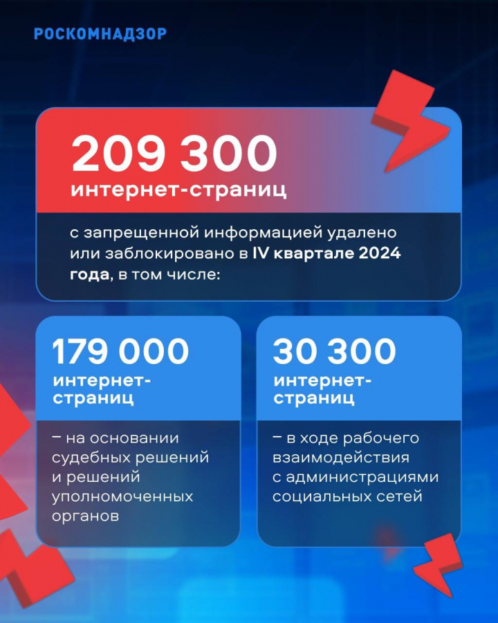 По данным ведомства, в четвертом квартале прошлого года РКН совместно с профильными ведомствами удалил или заблокировал более 228 тыс. ресурсов с запрещенной в РФ информацией.
