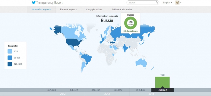 Глава Роскомнадзора Александр Жаров обвинил Twitter в систематическом игнорировании запросов. Чиновник прокомментировал свежие данные об открытости сервиса микроблогов. Накануне компания сообщила, что в июле–декабре 2014 года российские власти направили 108 запросов о раскрытии персональных данных, при этом ни один из них не был удовлетворен. За аналогичный период США направили 1622 запроса, касающихся 3299 аккаунтов, в 80% случаев Twitter предоставил данные об их владельцах.