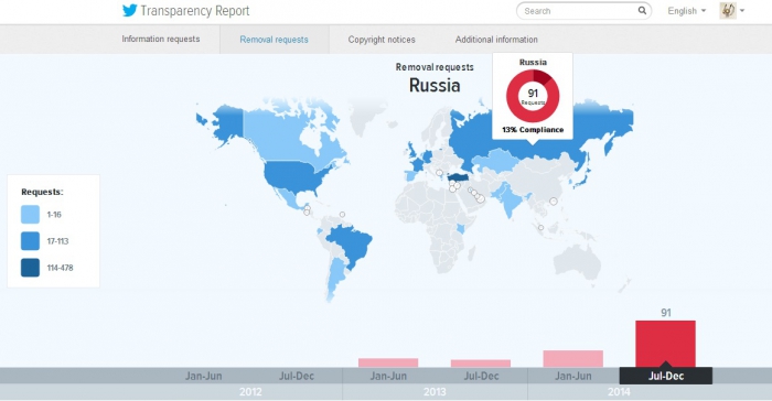 Недоумение Роскомнадзора вызвал и фактический отказ в удовлетворении «запросов о блокировке популярных противников российского правительства и других требований ограничить свободу слова применительно к массовым ненасильственным выступлениям на Украине». Согласно отчету, Twitter получил 2 судебных ордера и 89 запросов об удалении запрещенного контента. Компания удовлетворила 13% из них.