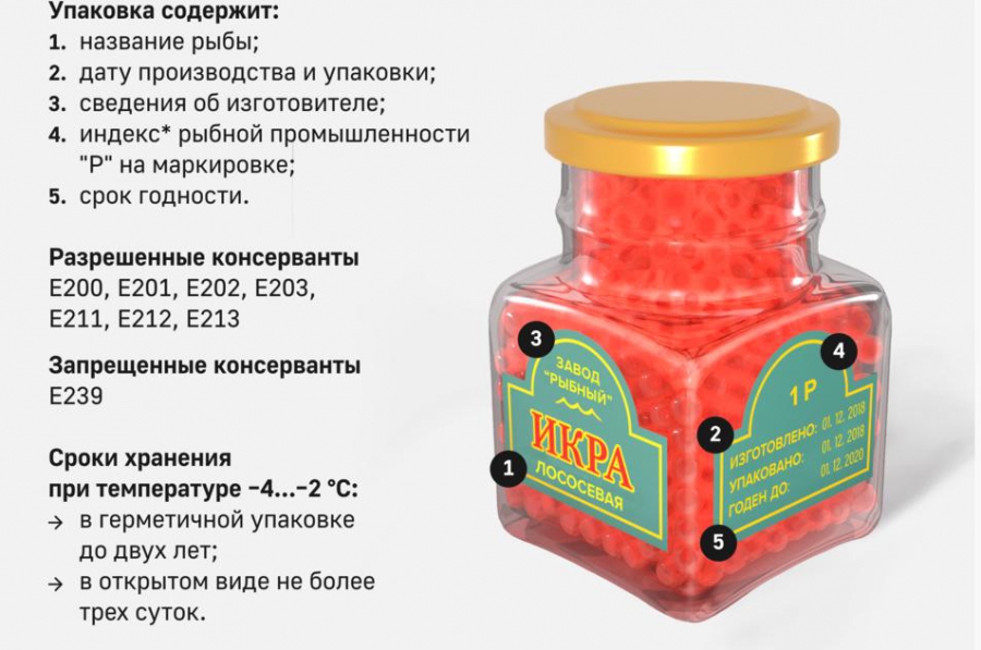 На жестяной банке должна находиться дата изготовления, слово «Икра», номер завода-изготовителя, номер смены, а также индекс рыбной промышленности «Р». Кроме того, на этикетке должно быть написано название рыбы, из которой была изъята икра. Крышка банки не должна быть мятой или вздутой, икра должна заполнять баночку полностью.